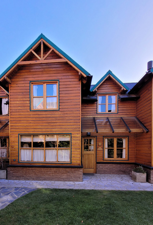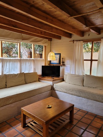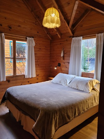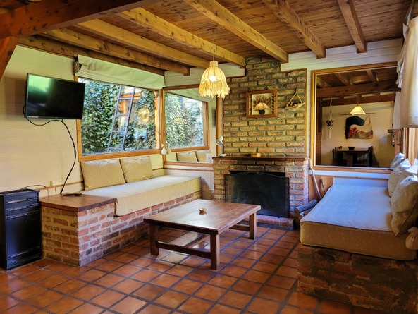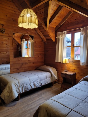 Cabaña distribuida en dos plantas, tiene una habitación con cama doble con somier de 1,60x2m (o dos camas de una plaza). Otra habitación con 2 camas de una plaza. 2 baños, uno con bañera, el otro en planta baja con ducha. Living, con 2 camas, comedor y cocina. 2 TV con cable, calefacción y hogar a leña.