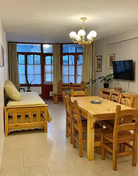 Amplio living comedor con mesa de 2x 1m, sofa cama doble y salida al balcon con vista al Cerro Curruhuinca.