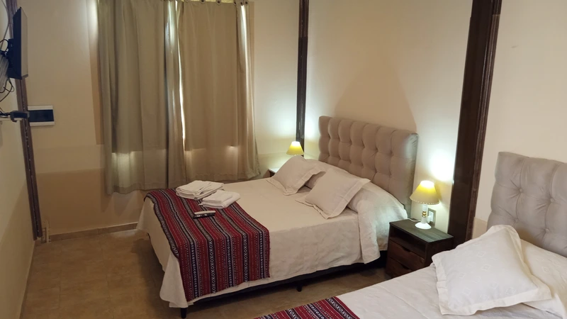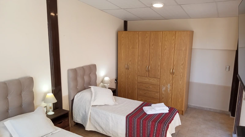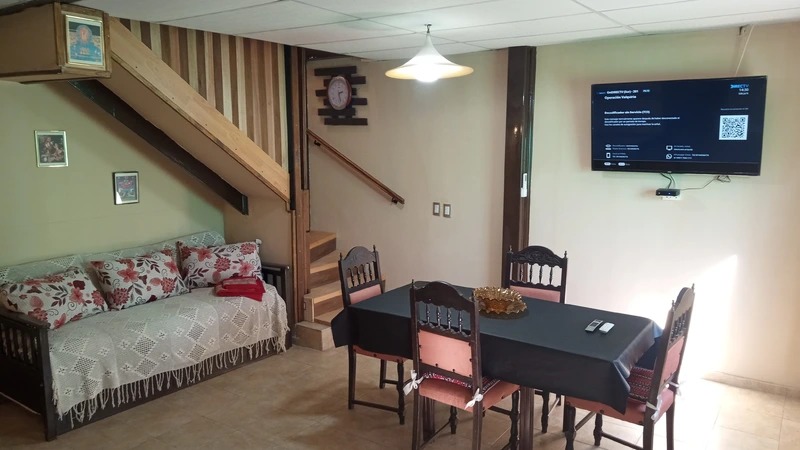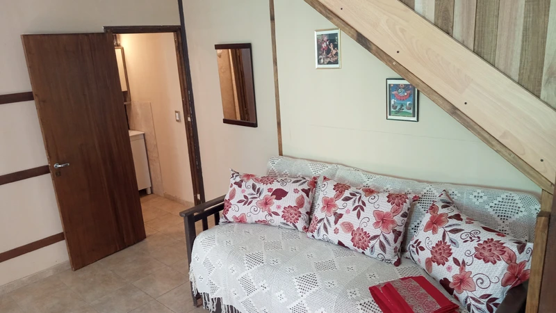 Habitación en la parte superior, con un sommier matrimonial y otro de plaza y media; DirecTv y Aire Ac. En la sala, sofá cama para dos personas por separado.