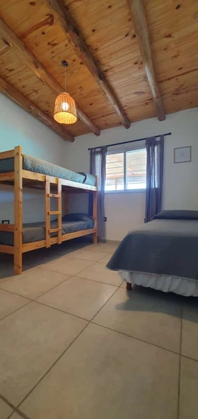 Una segunda Habitación con 3 plazas: una cucheta y un sommier de 1 plaza y media. (Puede agregarse una cuarta plaza en cama con carro) y estante para ropa.