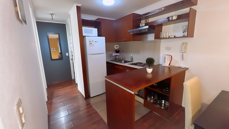 - Cocina americana amoblada y equipada con refrigerador, microondas, horno, cocina eléctrica, hervidor, utensilios de cocina en general.