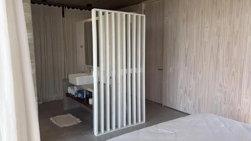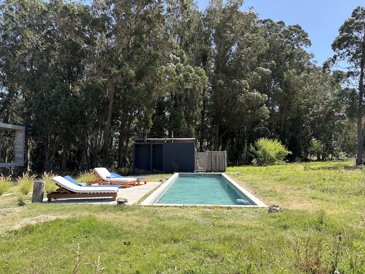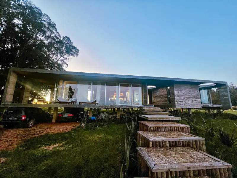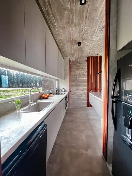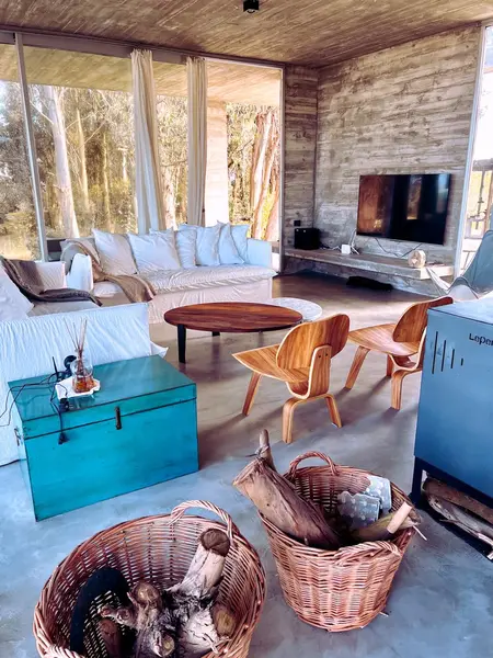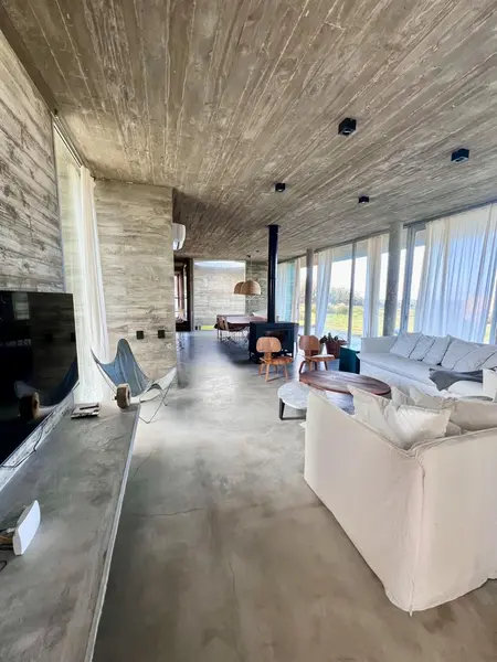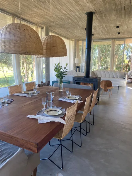 Moderna casa de hormigón, madera y vidrio en Tajamares de la Pedrera, Rocha, Uruguay, con vistas panorámicas al mar y al bosque de eucaliptos. Dispone de ventanales de 3 metros de altura con doble vidrio, tres dormitorios en suite, cocina abierta, lavadero, aire acondicionado frío/calor en todos los ambientes, y un hogar a leña con doble vidrio en el living. En el exterior, cuenta con una piscina de 12 x 3 metros (disponible de diciembre a marzo) y un parrillero con horno de barro.Tajamares de la Pedrera se encuentra a 10 minutos en auto de La Pedrera, a 40 minutos del Pueblo Garzón y a 1 hora de Jose Ignacio.