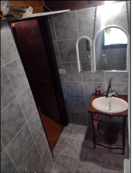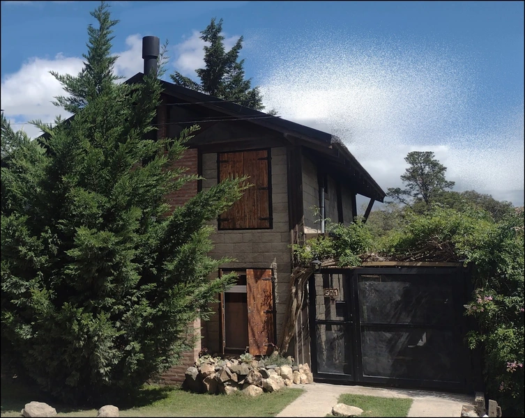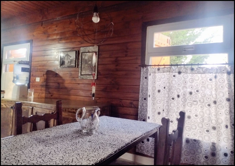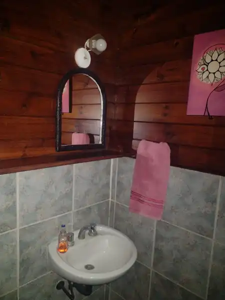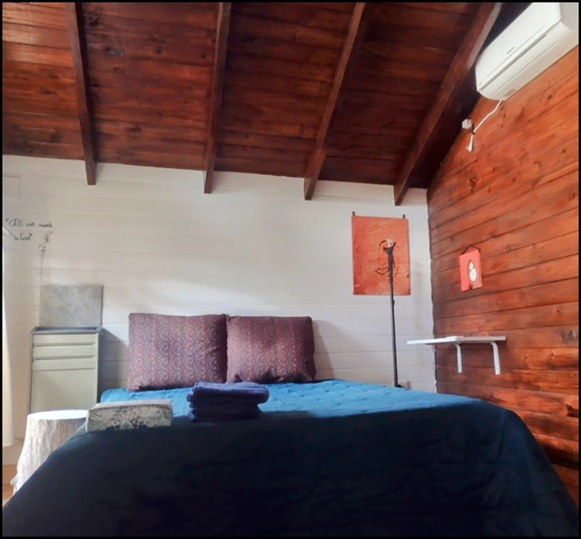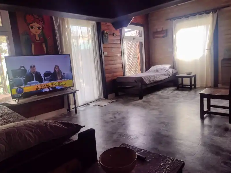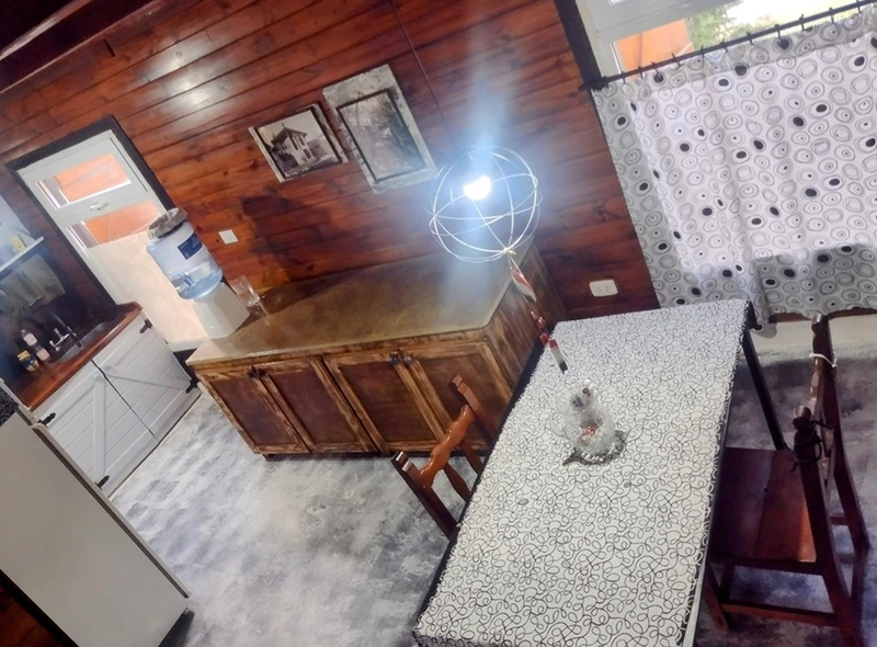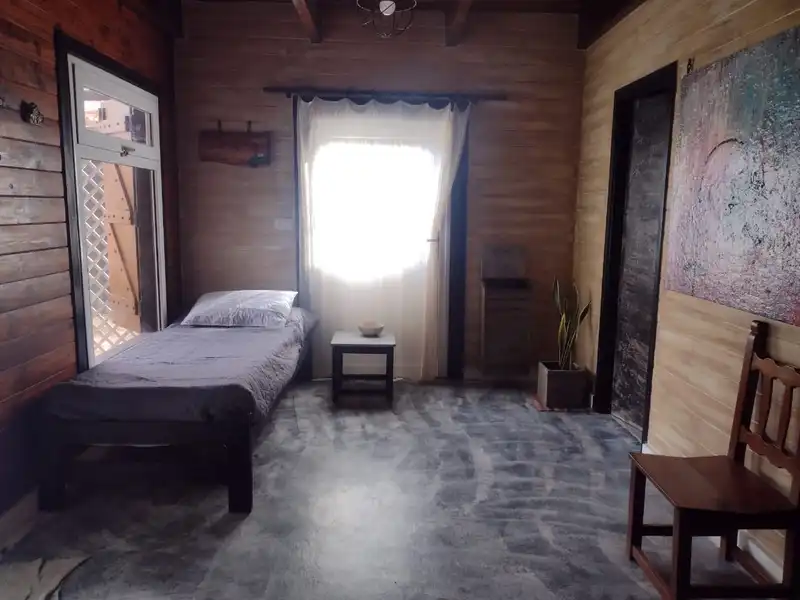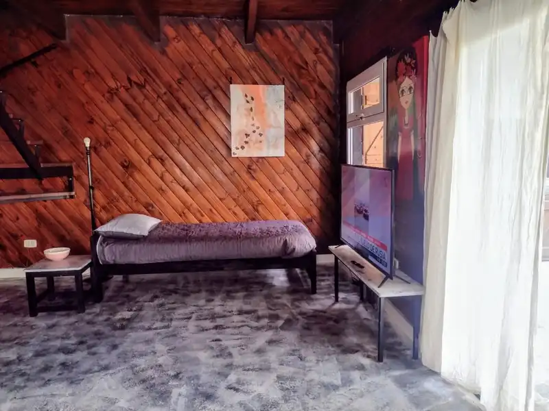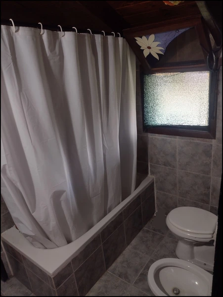 Cabaña 1 dormitorio, living con sofá cama, cocina comedor, baño, toilette, dormitorio privado en planta alta con baño con bañera. TV, WIFI, aire acondicionado y calefacción. Patio verde arbolado, galeria con parrilla y estacionamiento.
