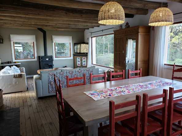 Amplio living comedor con salamandra vidriada y horno a leña / Tv 42' / Hermosas vistas.