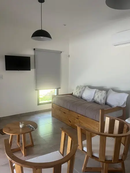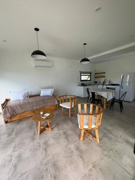 Cada casa cuenta con una habitación con sommier Queen, un divan cama en el living/comedor (dos camas una plaza), un baño completo con ducha, cocina living/comedor integrado con todos los elementos necesarios para cuatro personas (cocina, heladera, microondas, pava eléctrica, etc), aire acondicionado frio calor en comedor, smart tv, WIFI, alarma, parrilla en galeria individual y estacionamiento dentro del complejo.