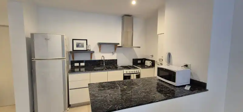 Cocina equipada con horno y anafe, extractor, microondas, heladera con freezer, pava eléctrica, tostadora y vajilla para 4 personas. WiFi rápido. Incluye ropa de cama y toallas. Ideal para viajes de negocios o placer.