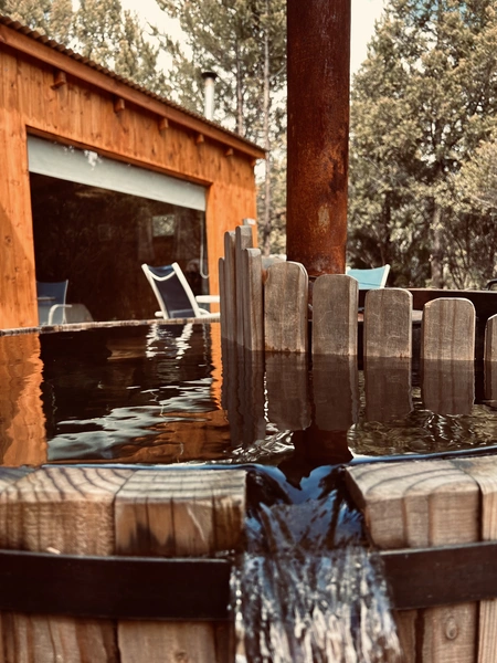 🛀 Tina de agua caliente privada, la estrella del lugar, permitiendo un descanso al máximo.