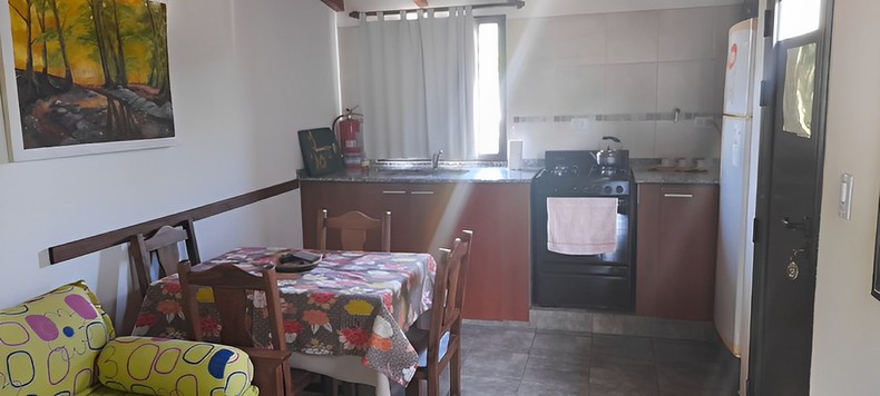 - Departamento en planta baja equipado con cama matrimonial, cama de una plaza, frigo bar, horno eléctrico,pava eléctrica, anafe, vajilla completa, ventiladores en todos los ambientes, LED 32´ y TV en dormitorio, TV por cable, ropa blanca.
