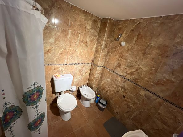 Un dormitorio con cama de dos plazas, dos camas de una plaza en el comedor. 1 baño. Cochera