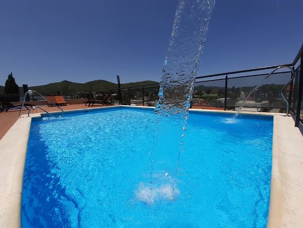 Piscina exterior y asadores en la Terraza del complejo, vista a las sierras de Córdoba