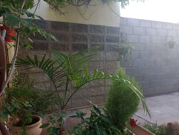 tiene una habitación con cama matrimonial con amplio placard y ventilador de pie de 20".
