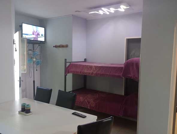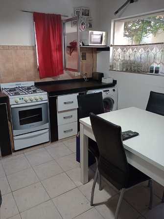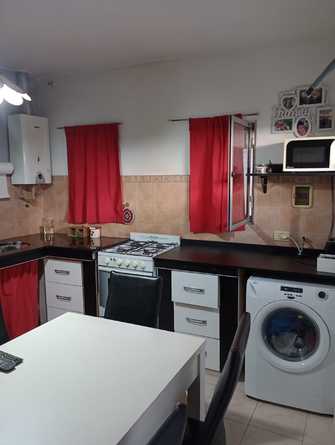 cocina comedor con una cama cucheta. La misma esta equipada con: tv, wifi, micro ondas, heladera con freezer, lavarropas y cocina.