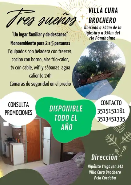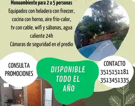 4 departamentos monoambiente hasta 4 personas y uno de 5/6. Cocina Equipada, heladera con frezzer, aire f/c , tv cable, wifi. Con cama matrimonial y camitas.