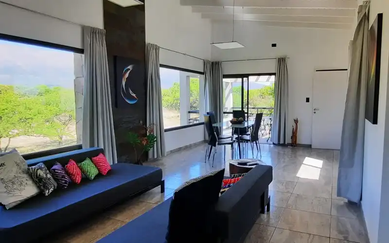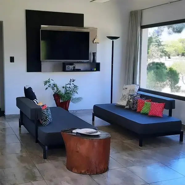 Ubicado a solo 4 km de Merlo, con acceso directo desde la Ruta 1 y dentro del bello barrio cerrado "Estancia El Carril" con una magnifica vista a la montaña. Construccion minimalista con excelente ambientacion y cuidados detalles. . Living con grandes ventanales que ofrecen una vista unica de la montaña. En él, dos sillones cama tipo industrial y mesa comedor. Amplia cocina totalmente equipada. El baño es compartimentado con duchador e hidromasaje. Todos los ambientes con aire acondicionado y television. Terraza propia con parrilla siendo un hermoso lugar para disfrutar. Es importante destacar que el uso de la pisicina es exclusivo.