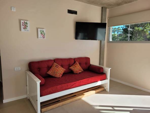 Living comedor con sillón diván de 1 plaza con carrito , ambos colchones en excelente estado. Tv led de 32" con videocable incluído . Wifi. Mesa y sillas para 4 personas.