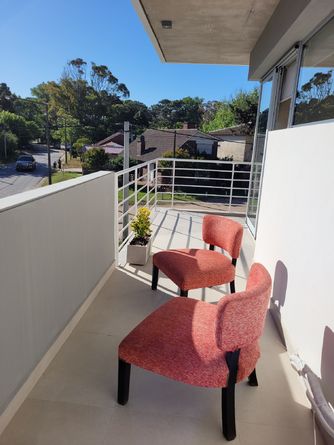Balcón con vista al frente o contrafrente de la propiedad según el departamento alquilado. Todos cuentan con sillones en los balcones y tender de ropas.