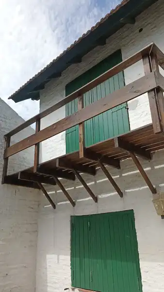Parrilla en un amplio balcon terraza con vistas arboladas en un entorno de naturaleza que se escucha el cantar de los pajaros con mesas y sillas