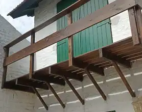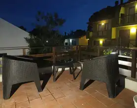 Parrilla en un amplio balcon terraza con vistas arboladas en un entorno de naturaleza que se escucha el cantar de los pajaros con mesas y sillas
