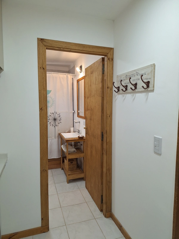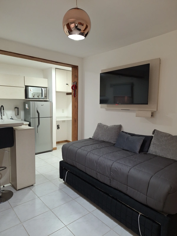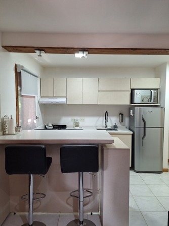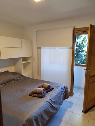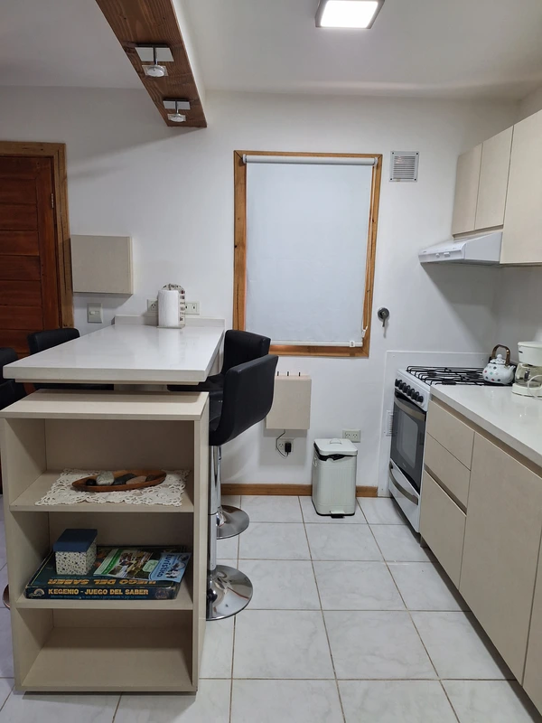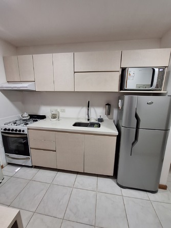 Moderno y luminoso departamento con balcón, cocina muy bien equipada con amplia barra desayunadora. Cuenta con heladera con freezer, microondas, tostadora, caferera electrica, cocuna con horno a gas y vajilla completa.Baño completo con bañera y secador de pelo.