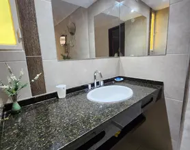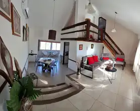 3 Dormitorios (1 dormitorio principal en P.B. sommier queen (1.60x2.00), y 2 dormitorios en P.A. de los cuales 1 es tipo loft con 2 sommiers individuales c/u., TOTAL 6 huéspedes - Baño principal zonificado.