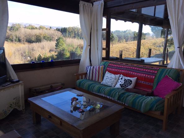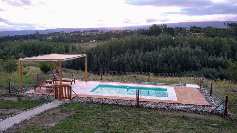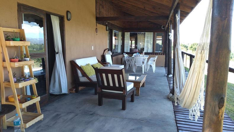 Gran Cabaña con Vista a las Montañas y al Champaqui , 180 m2 de 3 dormitorios para 8 / 10 personas sobre un inmenso lote de casi 1 hectarea , Gran galería con vista a las montañas con deck . . Podes tomar un vermouth o hacer un branch al aire libre sobre el mirador del deck , apreciando la naturaleza en su màxima expresiòn. En el living tenes un inmenso ventanal de 2 pisos que mira a todos lados , te vas a sorprender , con una vista y tranquilidad ùnicas !! 1 dormitorio grande con baño en suite , otro dormitorio con baño completo , 1 Amplio entrepiso tipo loft de 24 m2 o 3º dormitorio con cama matrimonial y cama de una plaza y otra plegable , Amplia cocina con mesa comedor y living con futon que se convierte en cama de 2 plazas . Cuarto de depòsito . Todos los ambientes con pisos ceramicos y zocalos de madera ..Amplio garage para 2 autos , parrilla con fogonero y disco de arado .